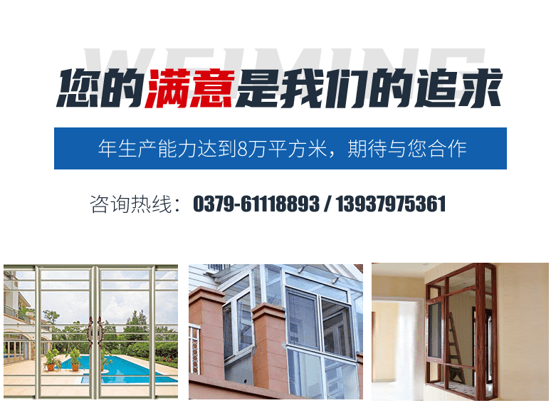 洛陽威明門窗有限公司是一家民營企業,企業位于具有五千年文明歷史的古都洛陽,公司占地五千多平方米,現有職工60余名,其中工程設計人員5名,技術人員12名,經過培訓的熟練工人21名,公司注冊資金1000萬元,擁有全套濟南“西格瑪”鋁合金設備一套塑鋼設備一套,主要生產的鋁合金窗、斷橋窗、幕墻、塑鋼窗和各種異形窗、推拉門、防火窗在洛陽門窗市場有著良好的口碑,年生產能力達到8萬平方米。  洛陽威明門窗有限公司立足中國國情,吸收當代優良技術之精華,采用國內優越的生產工藝,生產的多系列產品,具有結構合理,耐沖擊性強、隔音、隔熱、不變形、耐腐蝕、安裝方便、外觀整潔、裝飾性強等特點。  洛陽威明門窗有限公司在“您的滿意是我們永恒的追求”的經營理念指導下,從客戶利益出發,全天候為用戶提供多元化服務,嚴格加強質量管理,嚴格制定規章制度,實行三資企業的管理模式,采取“三工并存,動態管理”的用人機制,時時進行觀念創新、機制創新、管理創新、技術創新,形成了一套完善的管理體系,具有較高的管理水平。  我公司以精密的加工設備為保障,以優良的產品,完善的服務動力,是質量如生命,堅持“安全為先,質量可靠,用戶為尊”為宗旨,竭誠為廣大用戶服務。
